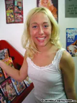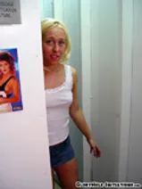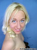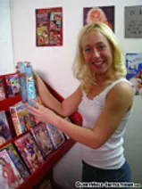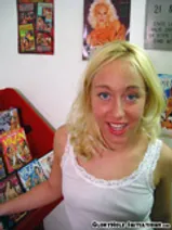 Goldie Coxx... Here's one cute little blonde with one of the BEST asses ever, not to mention she sucks a mean dick as well. Whe we get her into the adult bookstore she gets right to business. Before we could even get through the interview, she is already hiking up her skirt to play with her tight bald pussy. As soon as she sees a hrd dick pop through the hole, she drops to her knees and starts sucking! The money shot leaves Goldie in a gooey mess and she loves it!